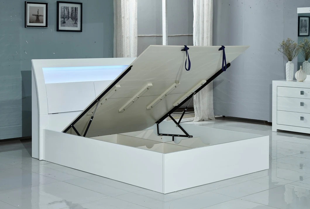 This collection features a platform bed (no box required) and a convenient pull-up hydraulic storage system with 4 spacious compartments—perfect for organizing bedding, clothing, and personal items.