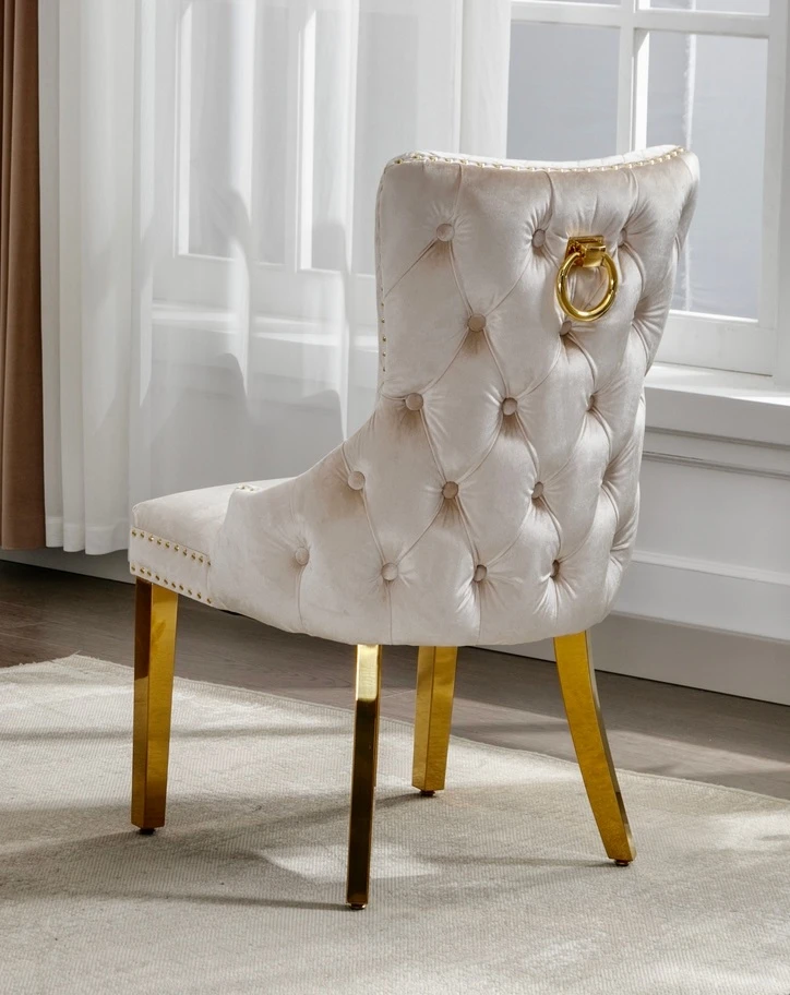 The set includes six upholstered dining chairs crafted with plush crème velvet fabric, deep tufted backs, and decorative gold ring handles for a touch of classic elegance. Supported by sleek polished gold legs, these chairs deliver superior comfort and a sophisticated finish, making them ideal for formal dining rooms or upscale open-concept spaces.