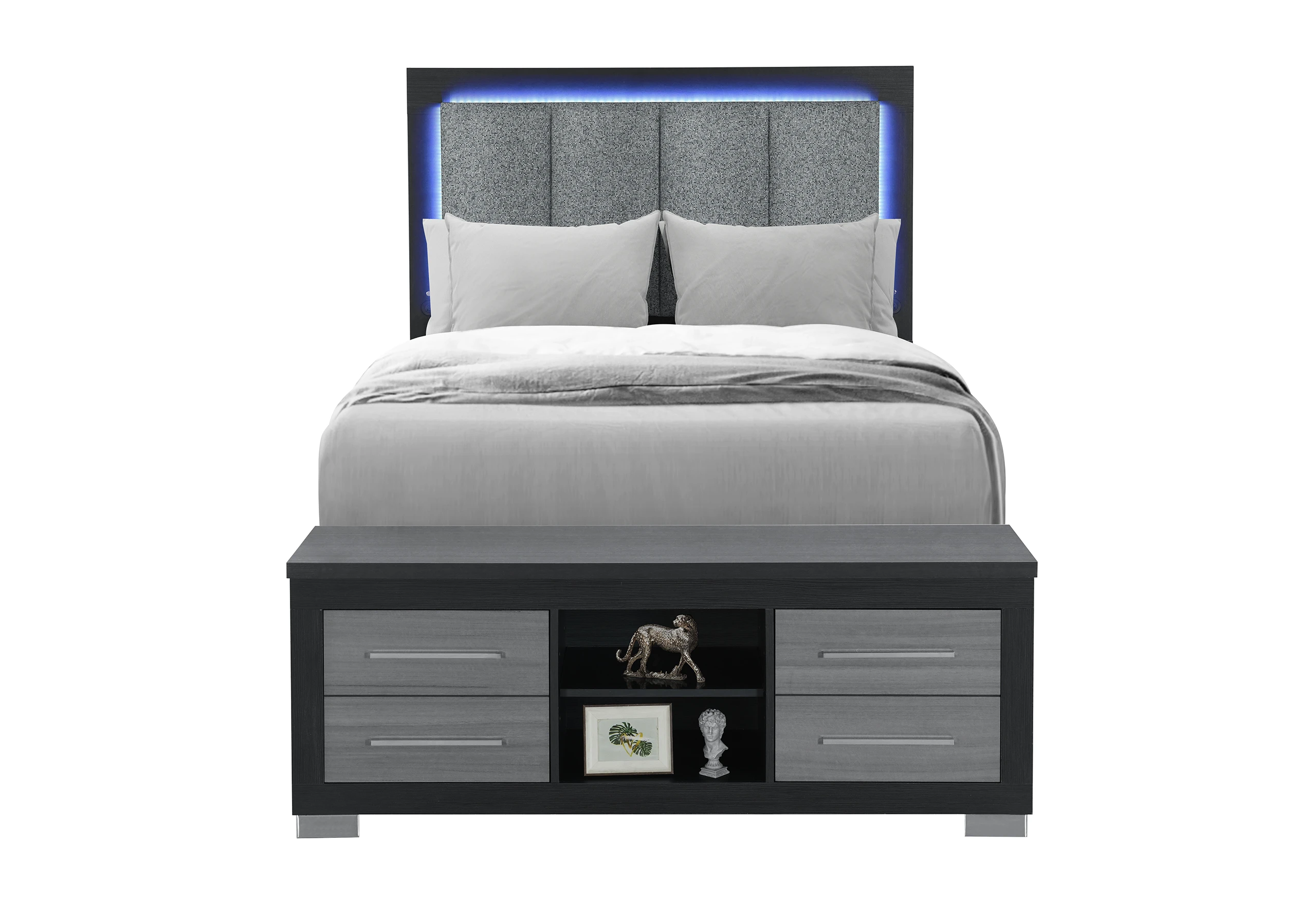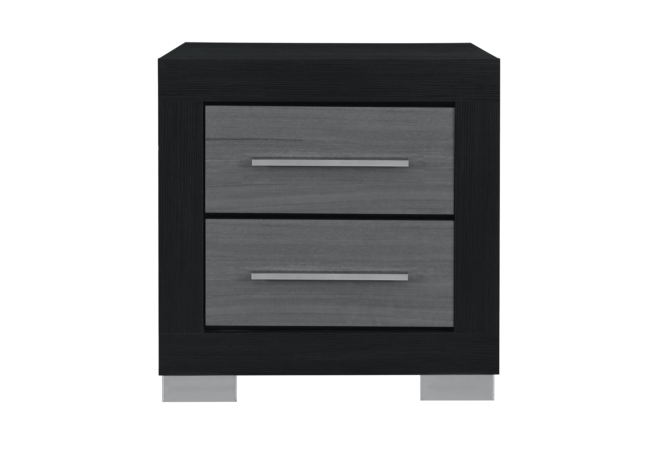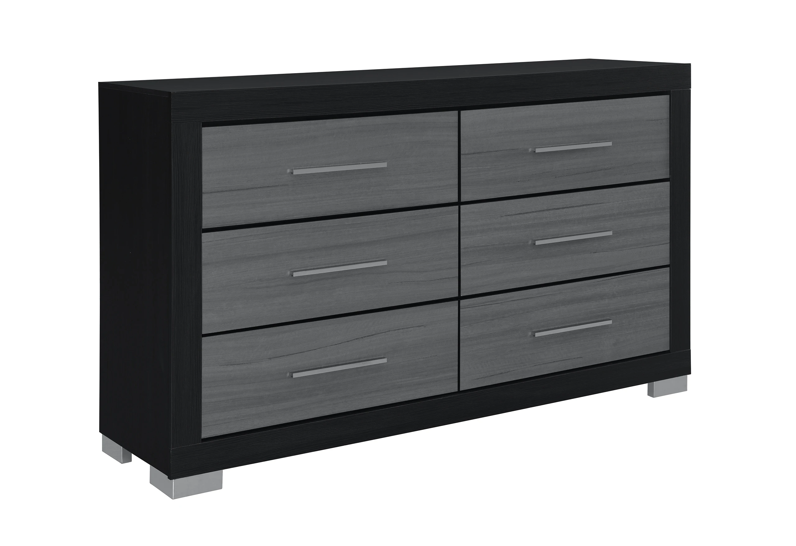 1. Make a statement with a bedroom set that is as functional as it is striking. The Emma Black collection features a dramatic matte black frame accented by textured grey drawer fronts, offering a sleek, monochromatic look that defines modern luxury.
