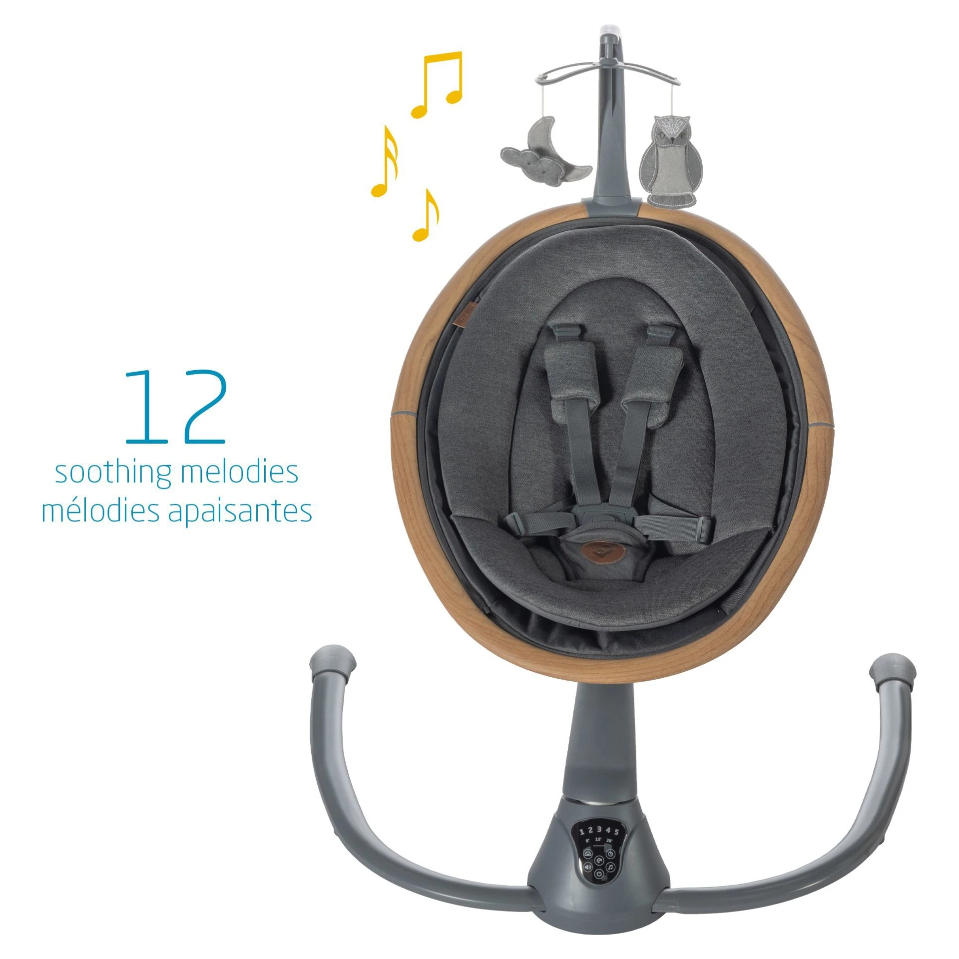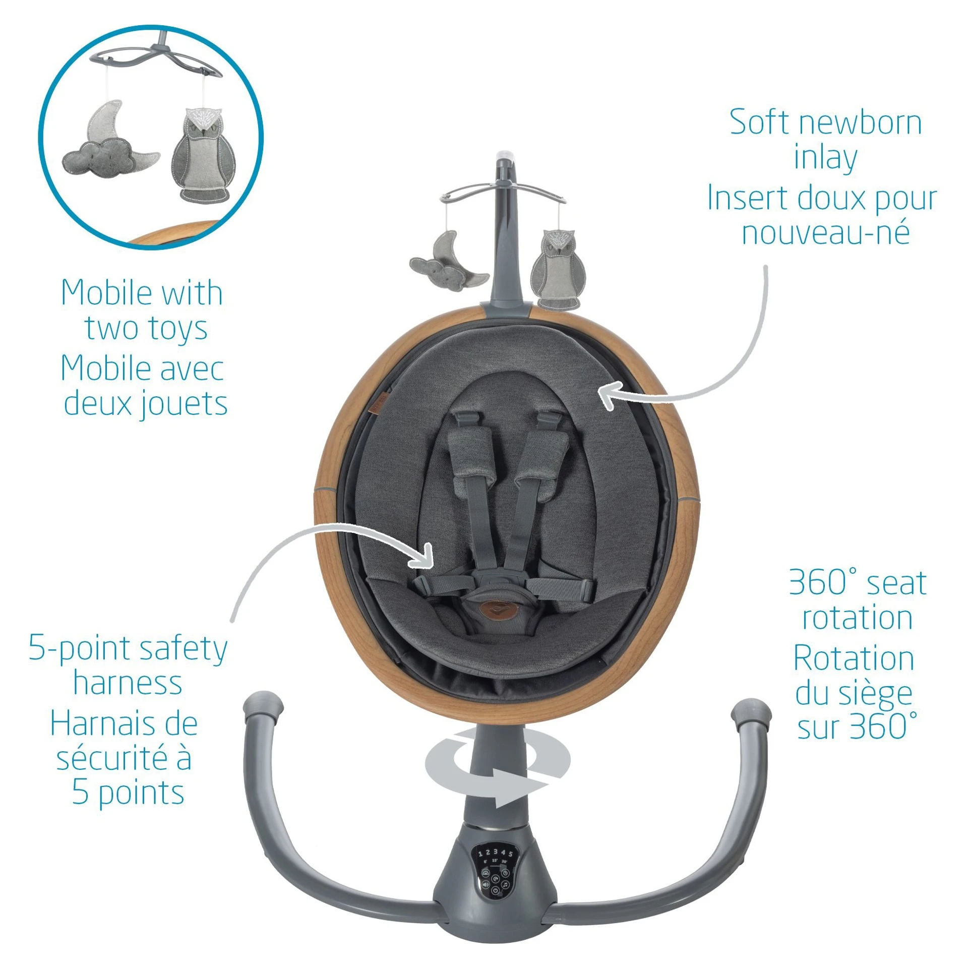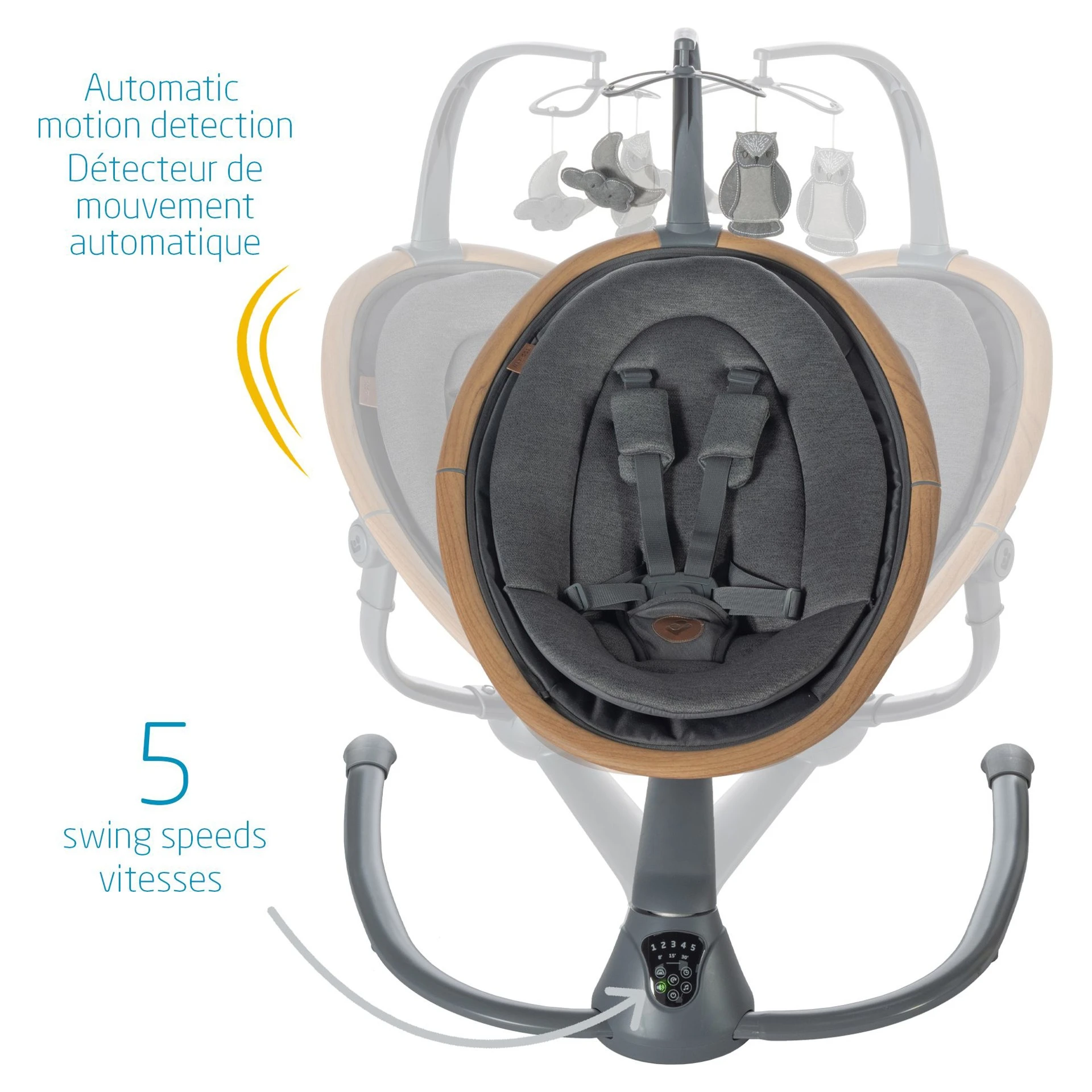 The Maxi-Cosi Cassia baby swing offers a gentle and intelligent solution. Designed for babies from birth up to 20 lbs, it provides soothing support whenever your little one needs comfort, allowing you to focus on your daily routine.