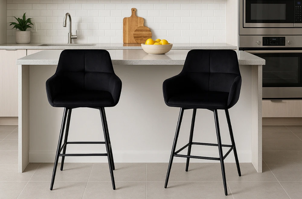 Add a modern edge to your kitchen or bar with these low back stools, designed to bring both comfort and class to any setting. Upholstered in rich black velvet, they offer a luxurious feel without being overstated—perfect for contemporary interiors.