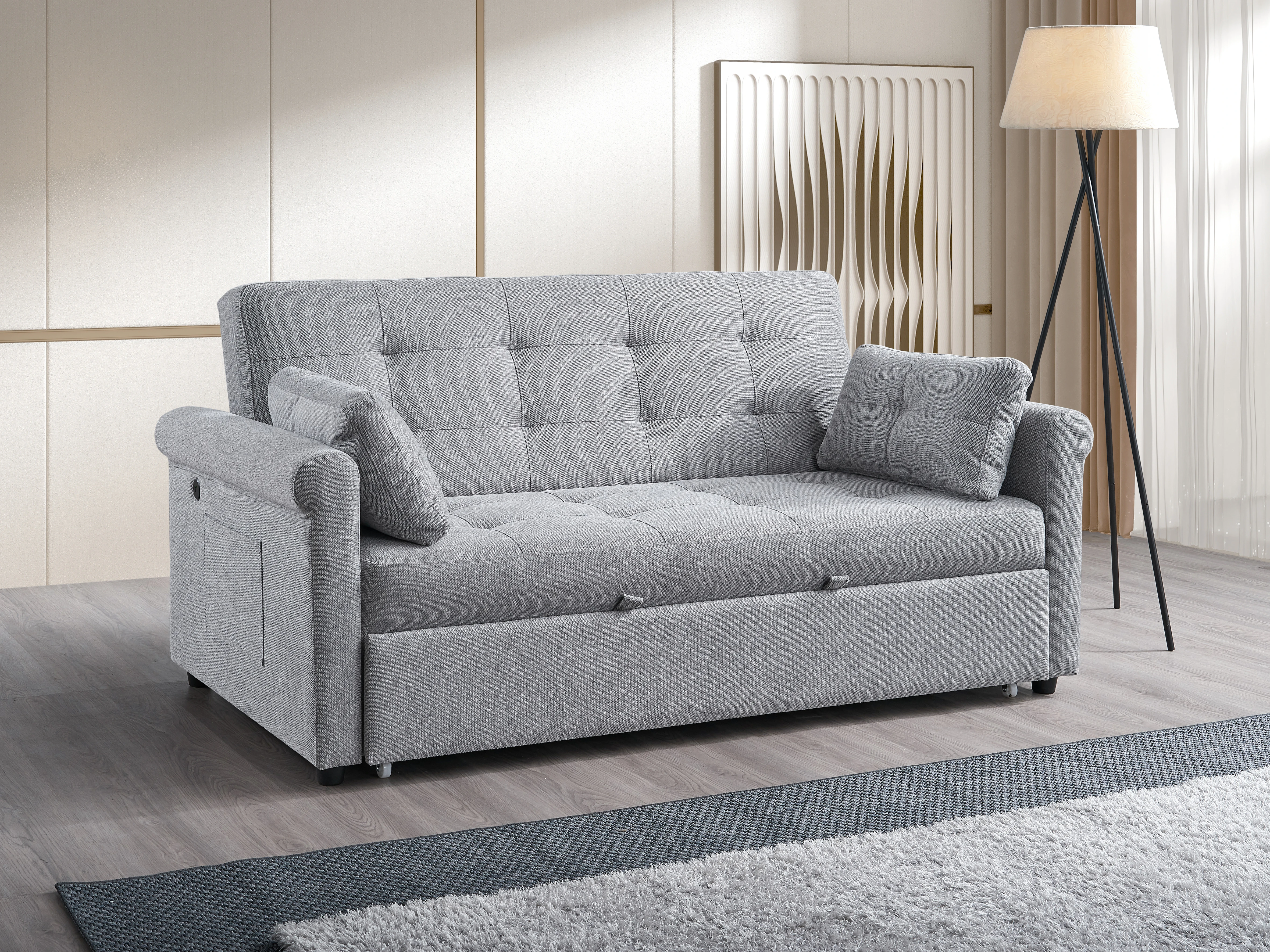 Designed for everyday convenience, it includes decorative cushions, a built-in charging station with 1 USB and 1 USB-C port, and a side storage compartment to keep essentials within reach. Combining comfort, functionality, and modern design, the IF-9046 sofa bed is a smart addition to any home.