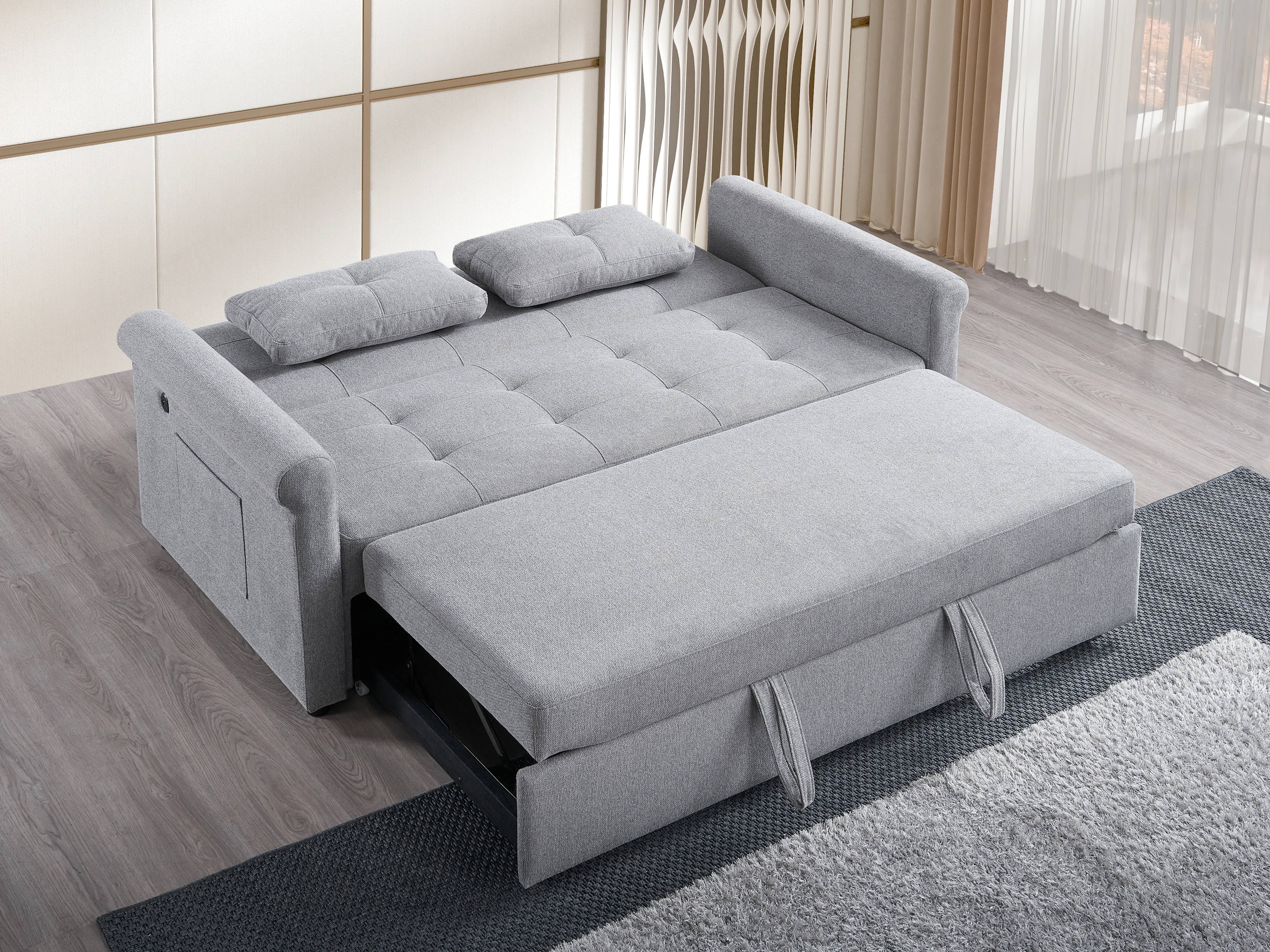 Featuring a 3-level adjustable backrest that fully reclines, this sofa bed allows you to customize your comfort whether you’re sitting, lounging, or sleeping. The tufted backrest and seat add a refined, contemporary look, while the soft cloud-grey fabric offers a smooth and cozy touch.
