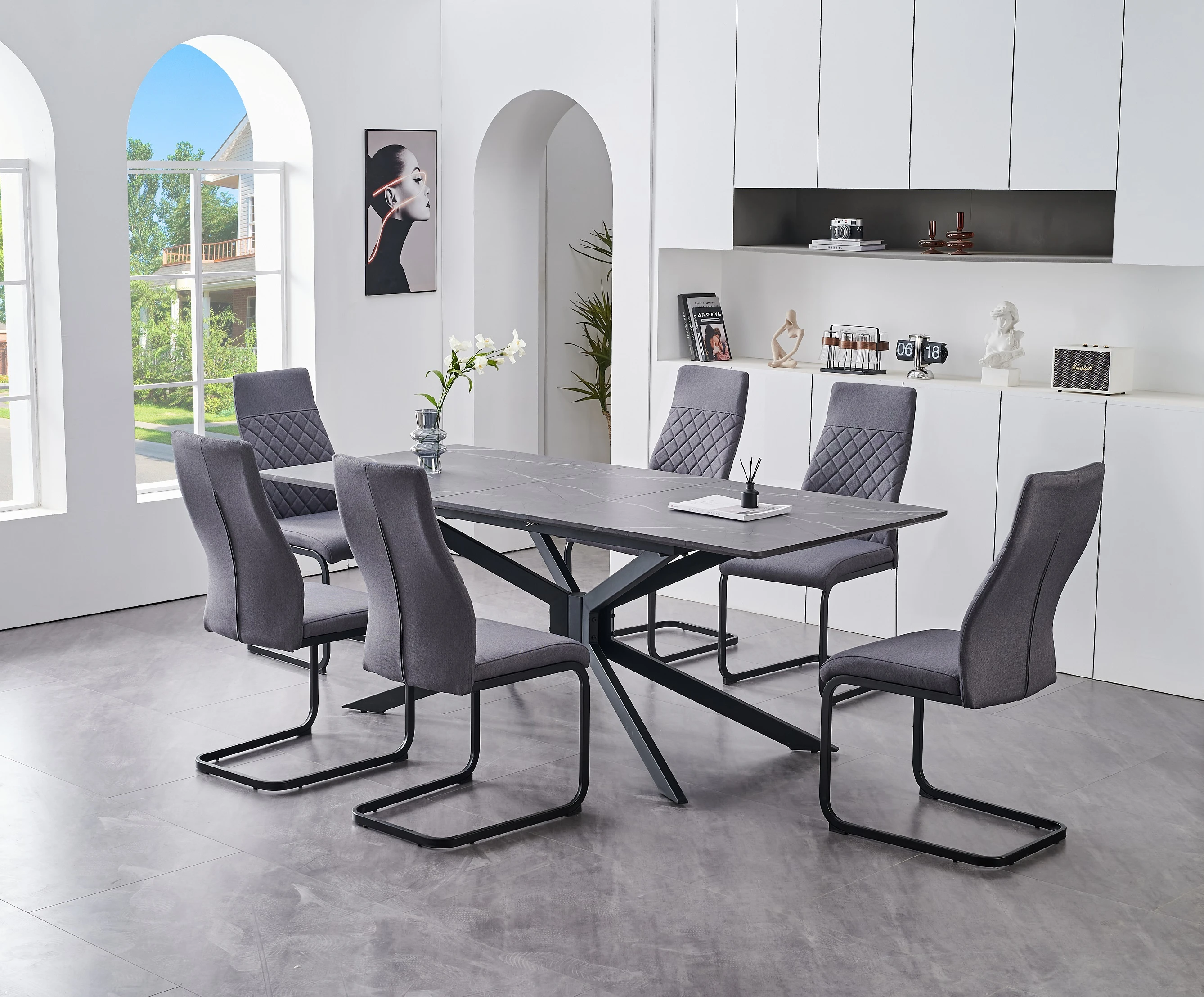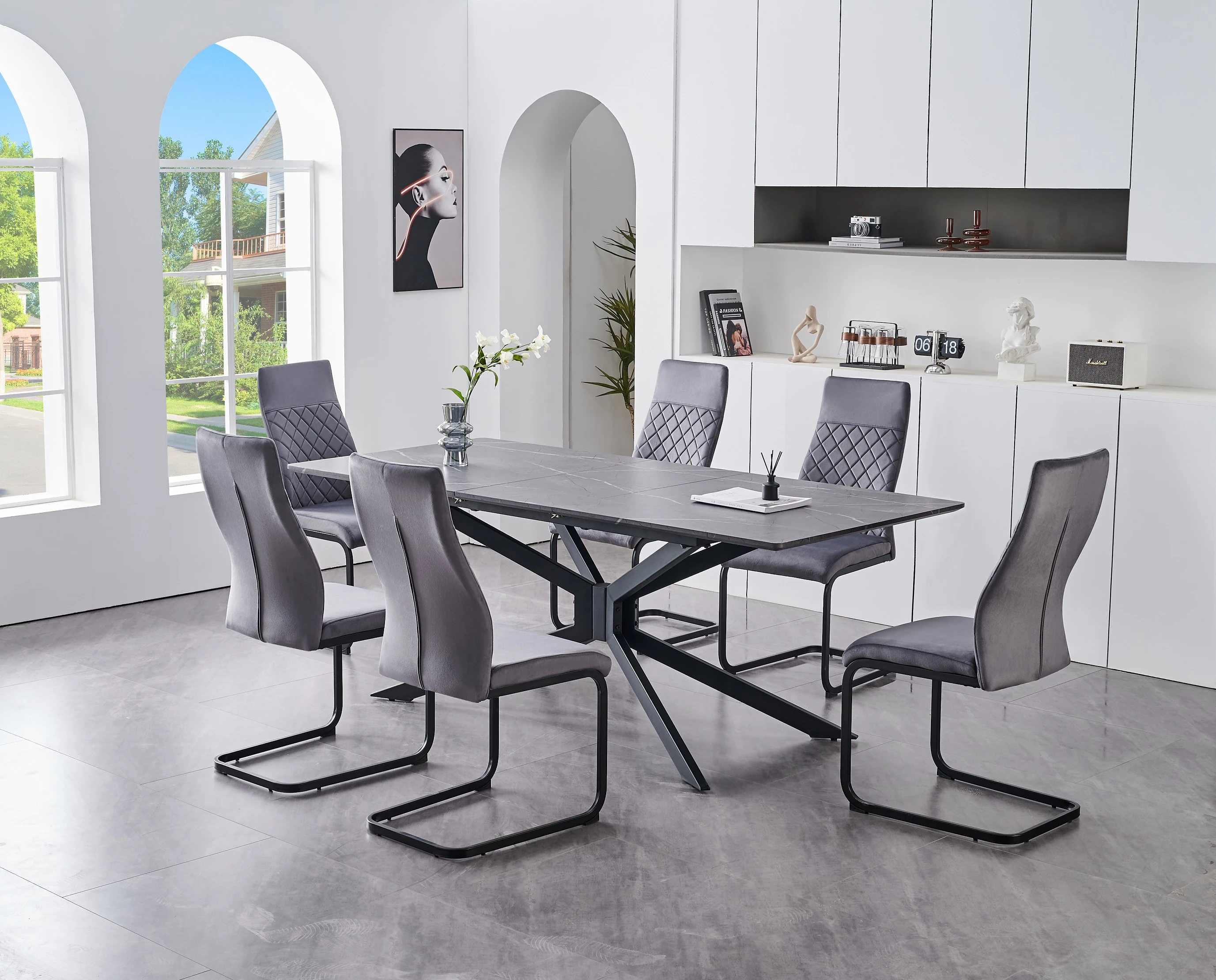 A modern extendable dining table featuring a durable faux grey marble top and a stylish X-shape black steel base. This table offers a clean, contemporary look that fits perfectly in modern dining spaces.