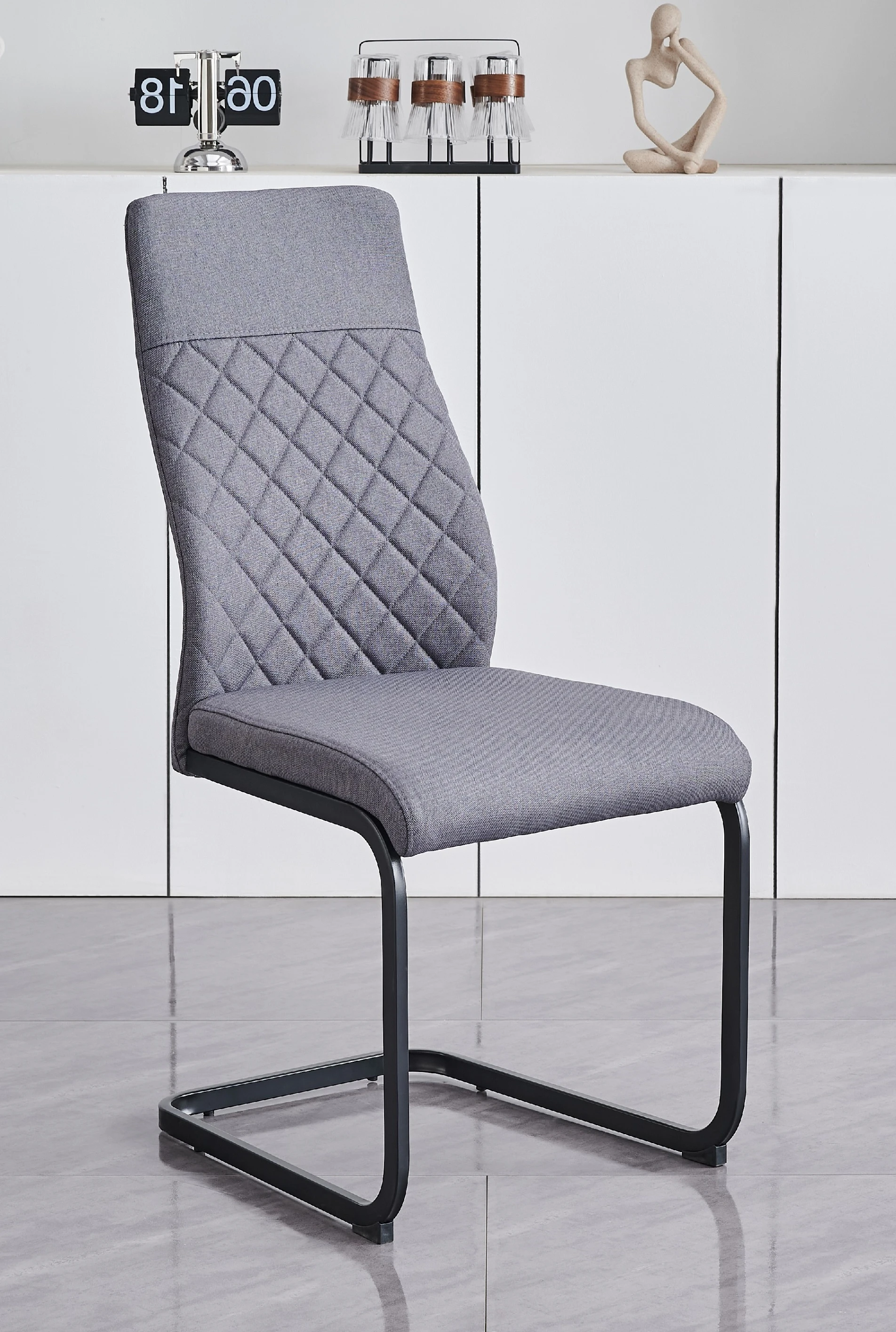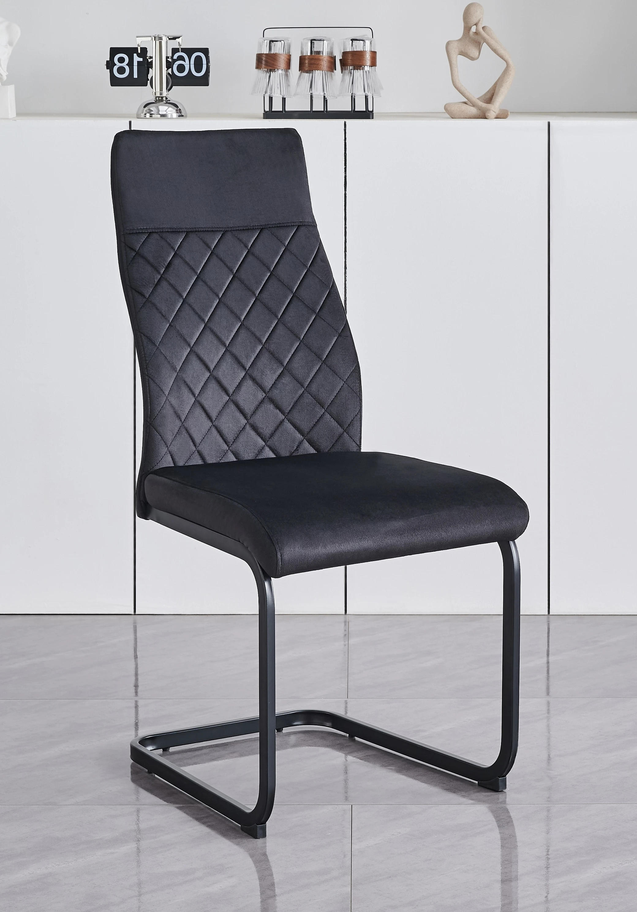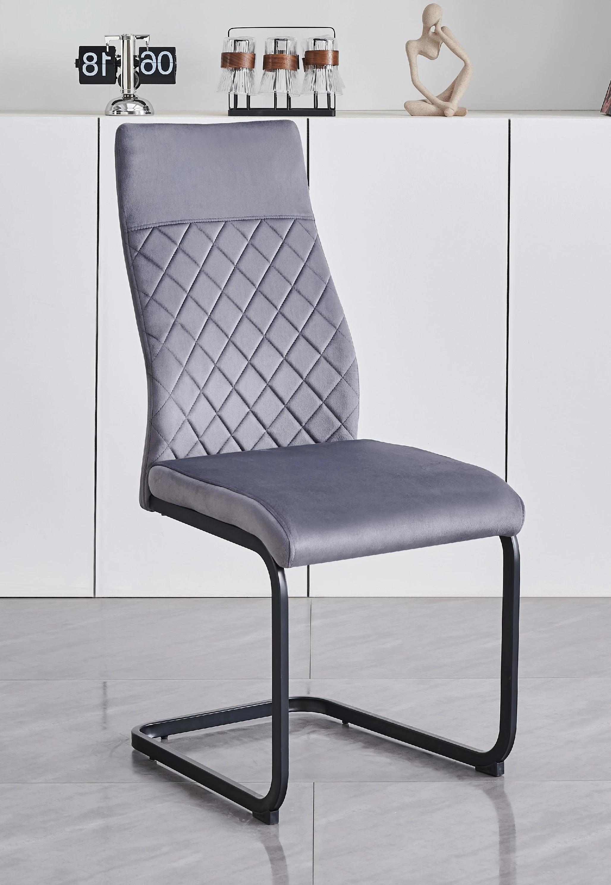 Elegant and comfortable side chairs designed with a C-shaped black steel base. Available in soft black velvet, grey velvet, or grey fabric with diamond-stitched details, these chairs add a luxurious touch to your dining room.
