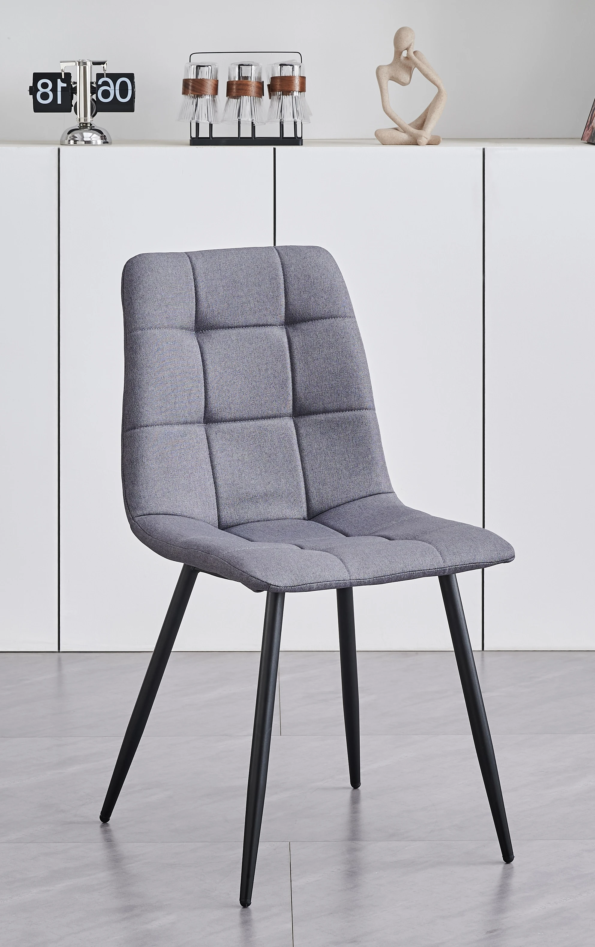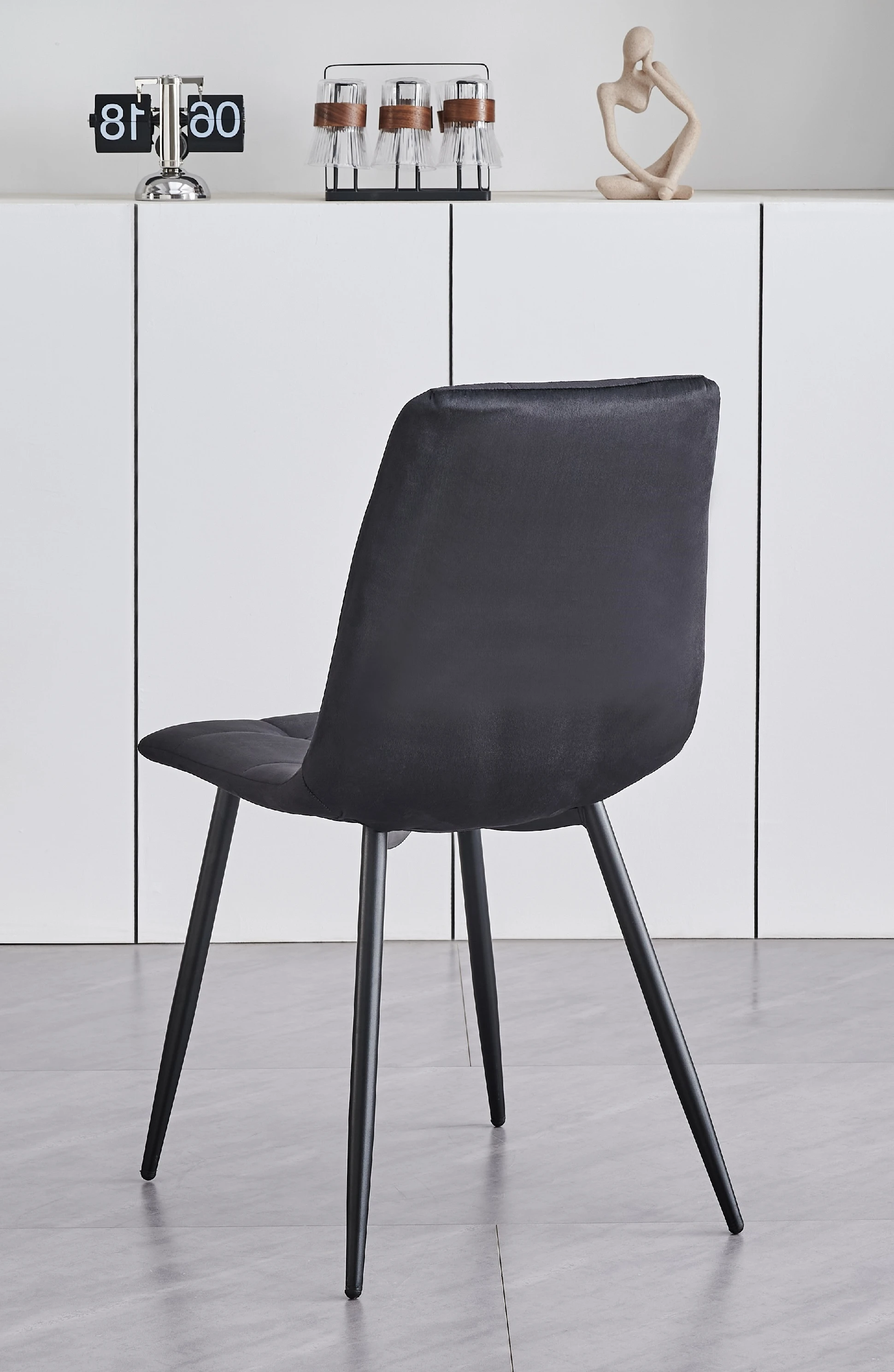 The chairs are designed for both comfort and style. Available in soft grey fabric or luxurious velvet, they feature a padded ergonomic back, refined cross-stitch detailing, and sturdy black steel legs.