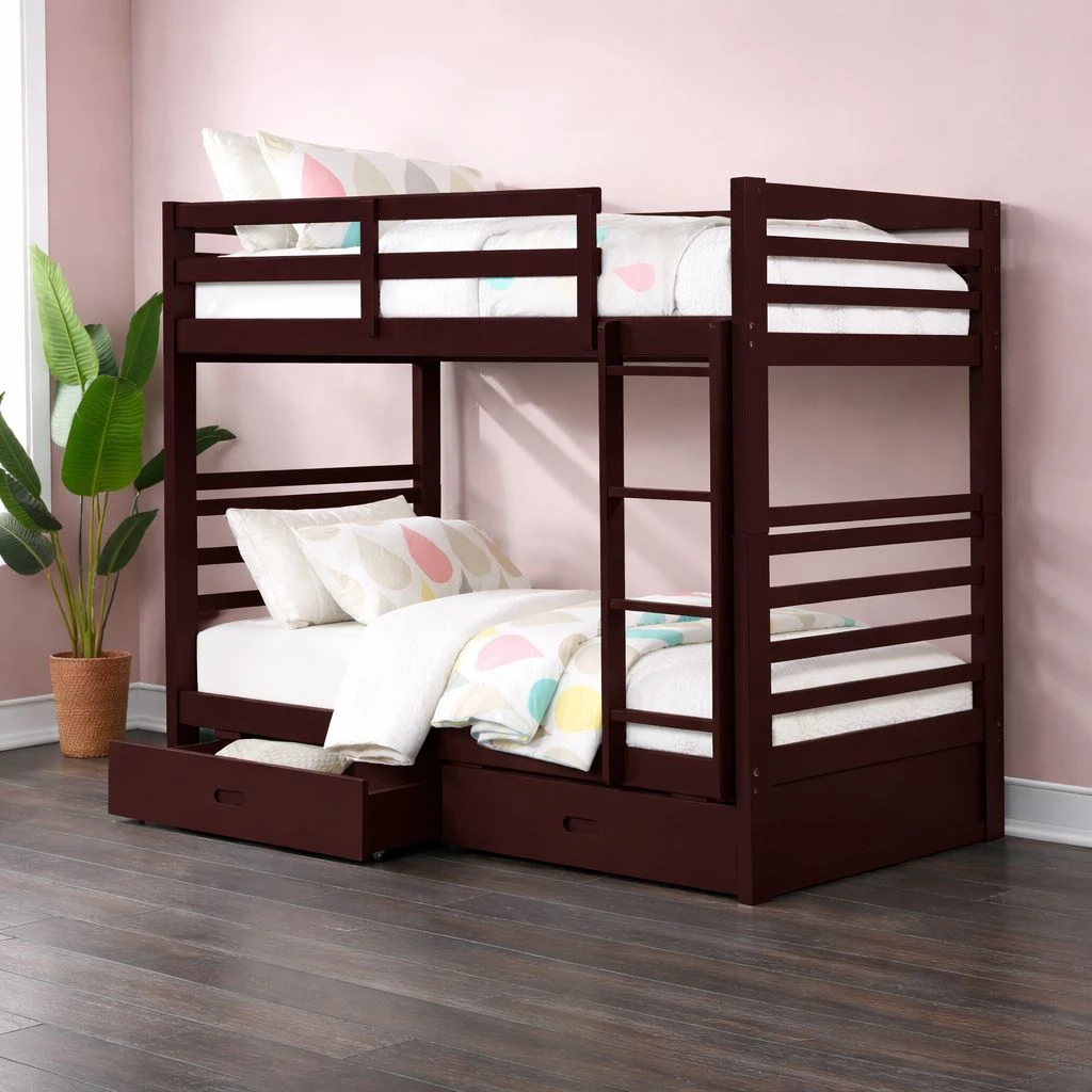 The clean lines and charming design elements of our bunk bed, combined with pine solids, create a relaxed and comforting style that suits various room decors. Choose from three classic finishes: espresso, grey, or white.