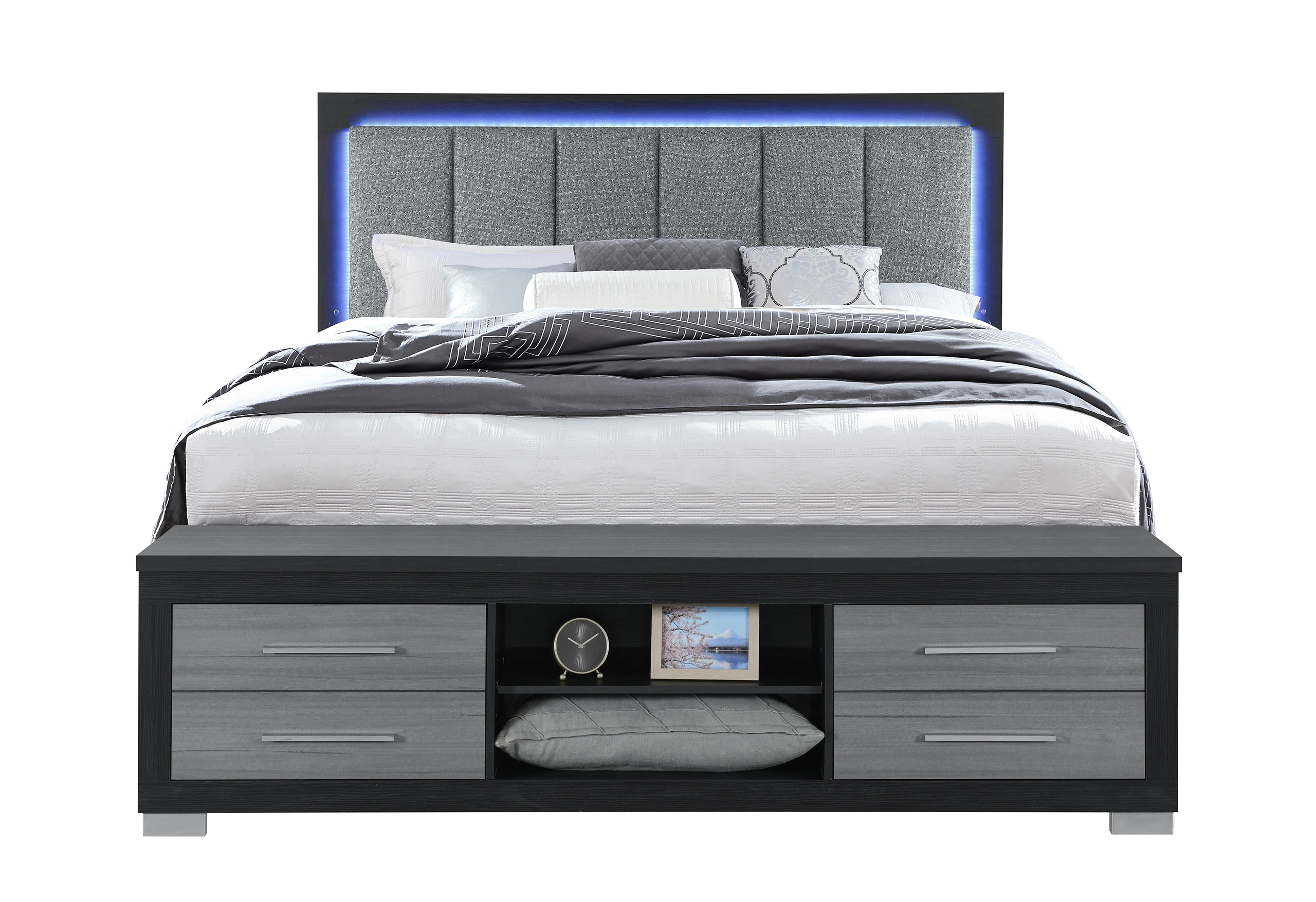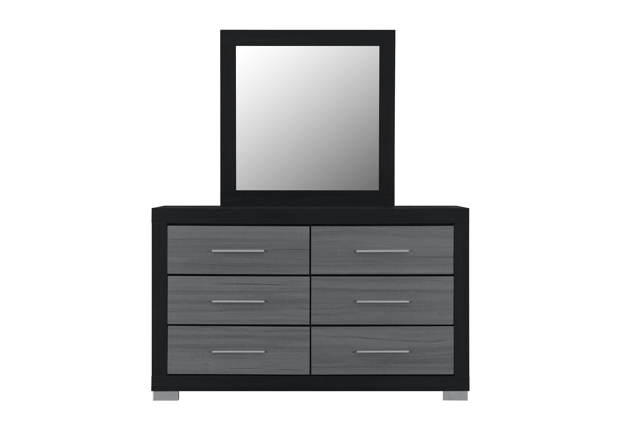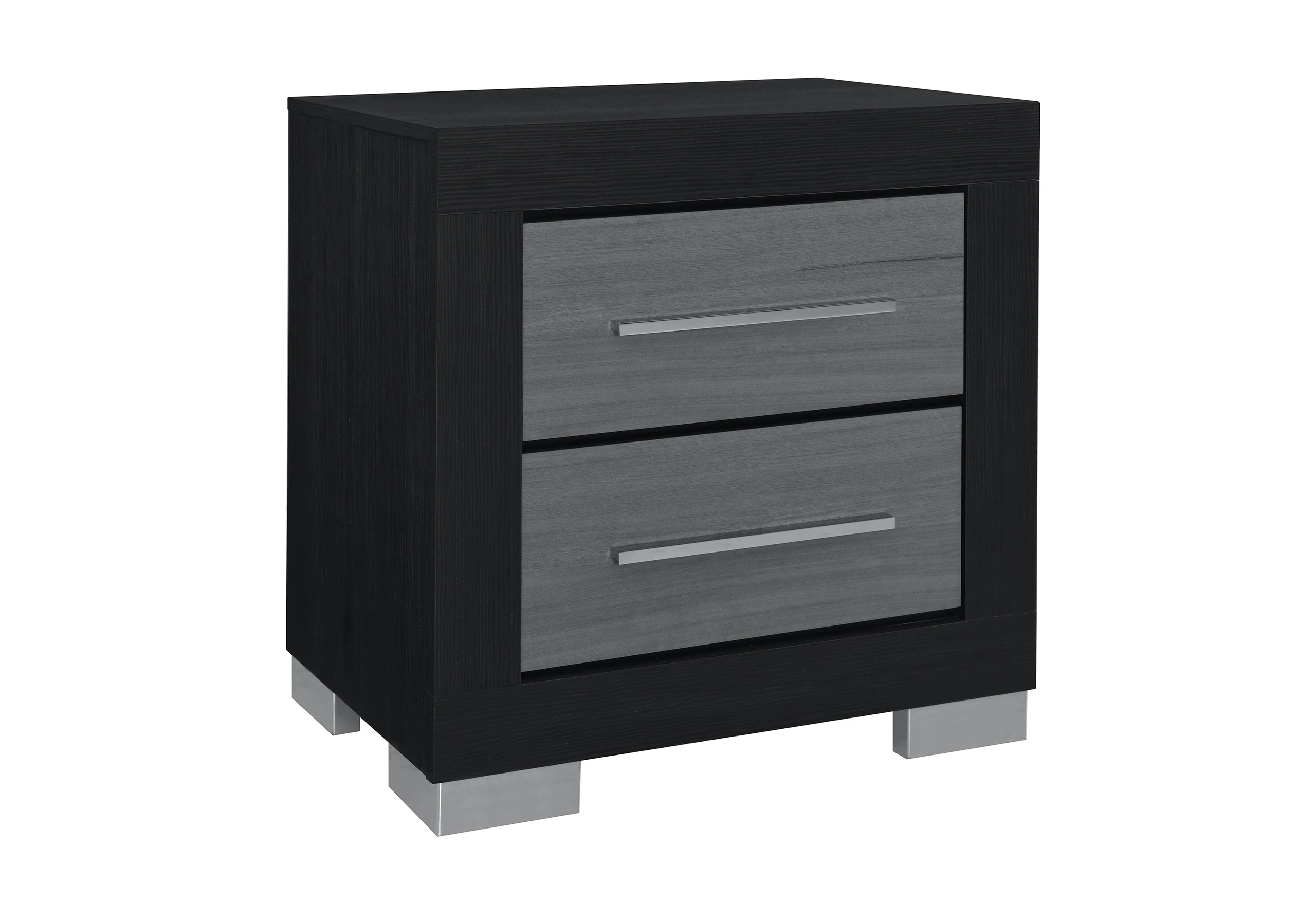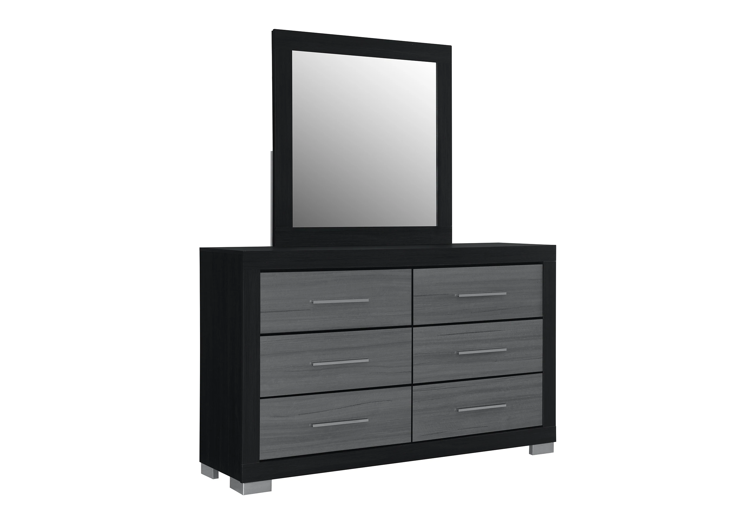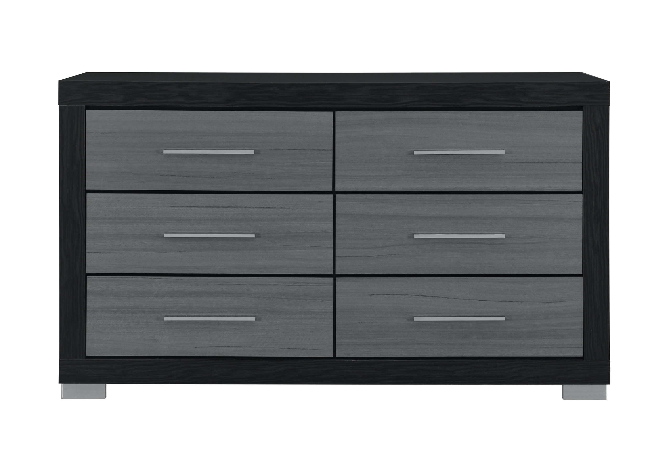 1. Make a statement with a bedroom set that is as functional as it is striking. The Emma Black collection features a dramatic matte black frame accented by textured grey drawer fronts, offering a sleek, monochromatic look that defines modern luxury.